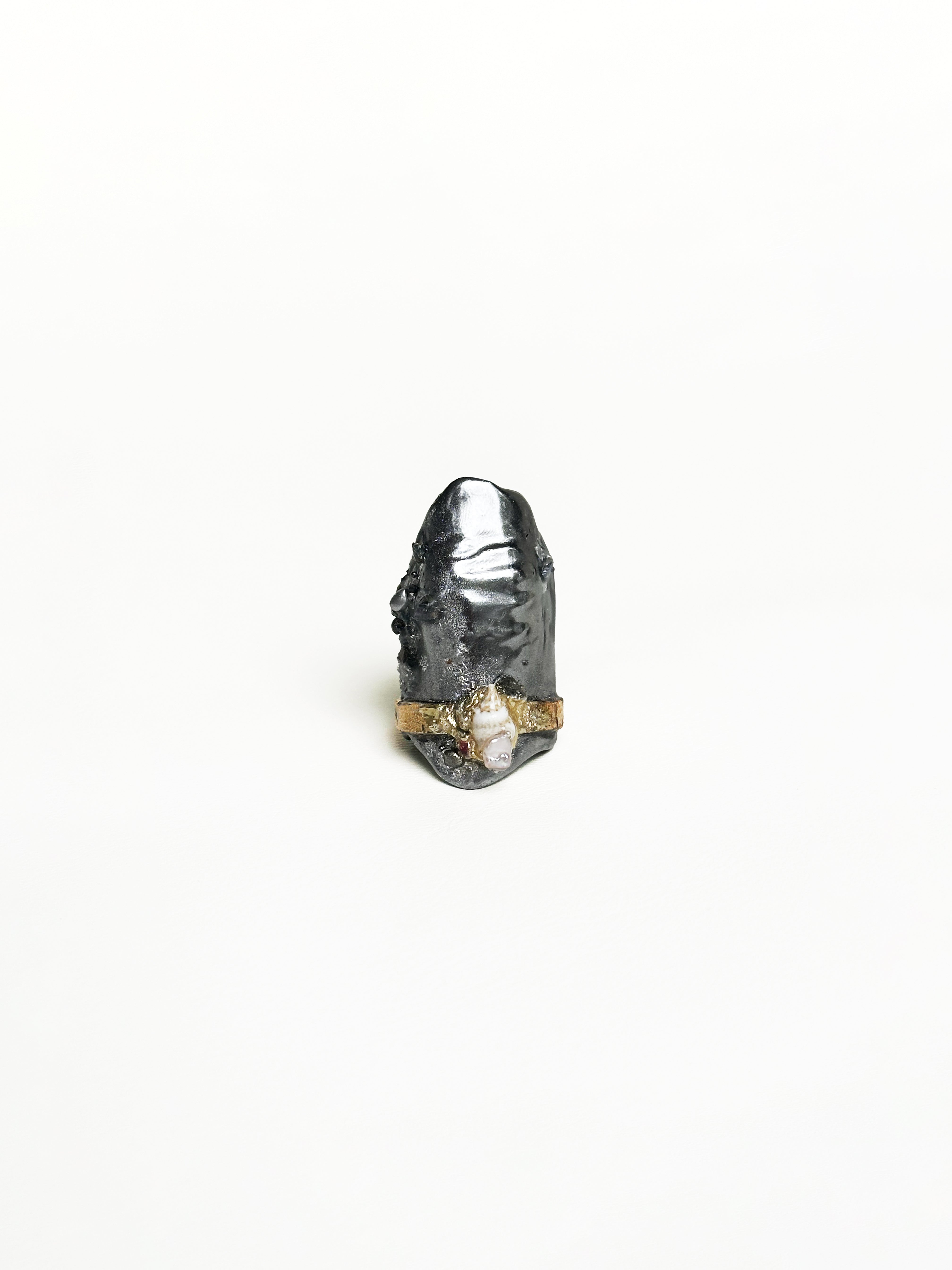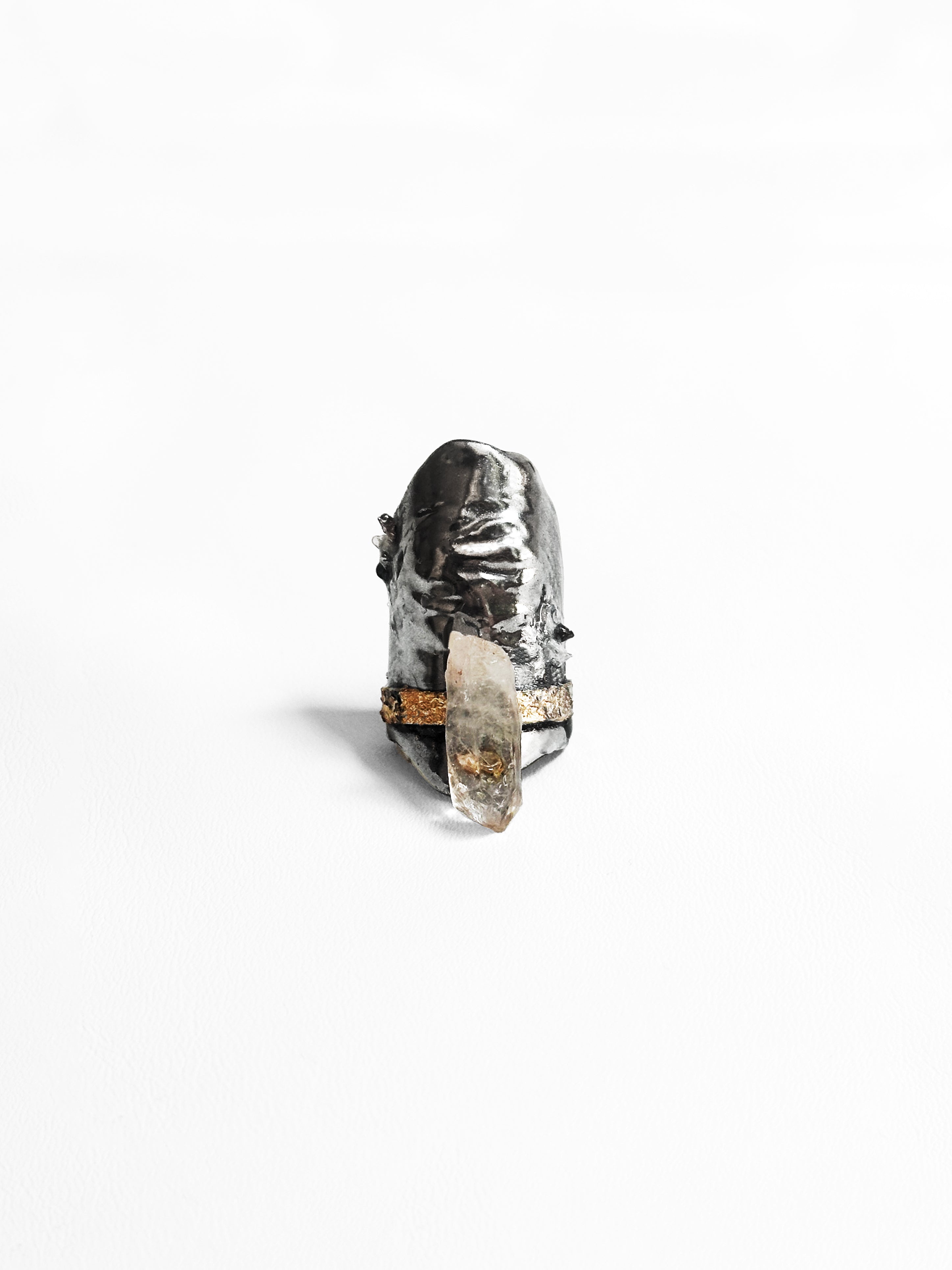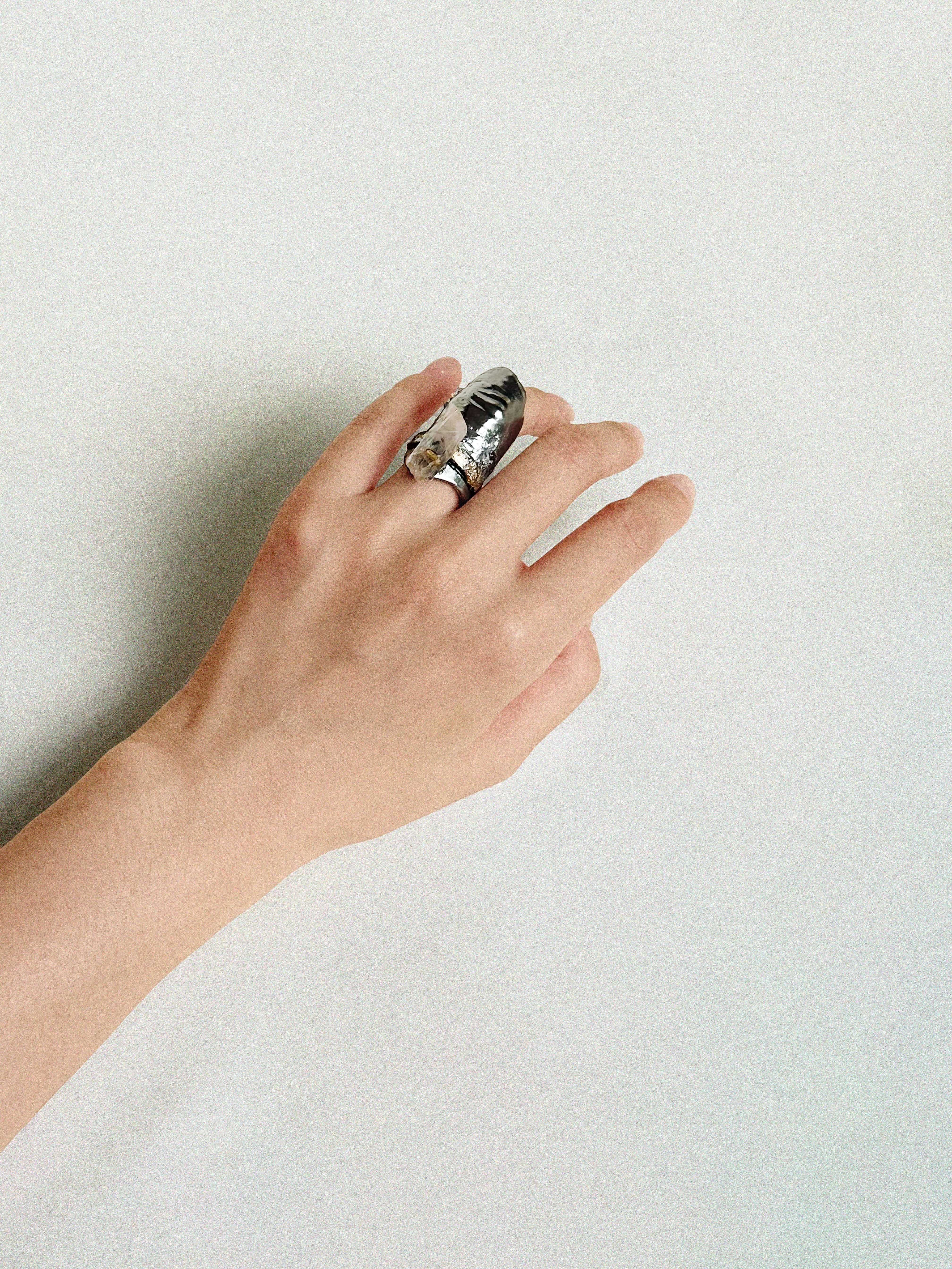 The collection features 3D-printed resin model with a metal-like finish. The Rings are adorned with gemstone inlays. Each piece is handcrafted and one-of-a-kind.