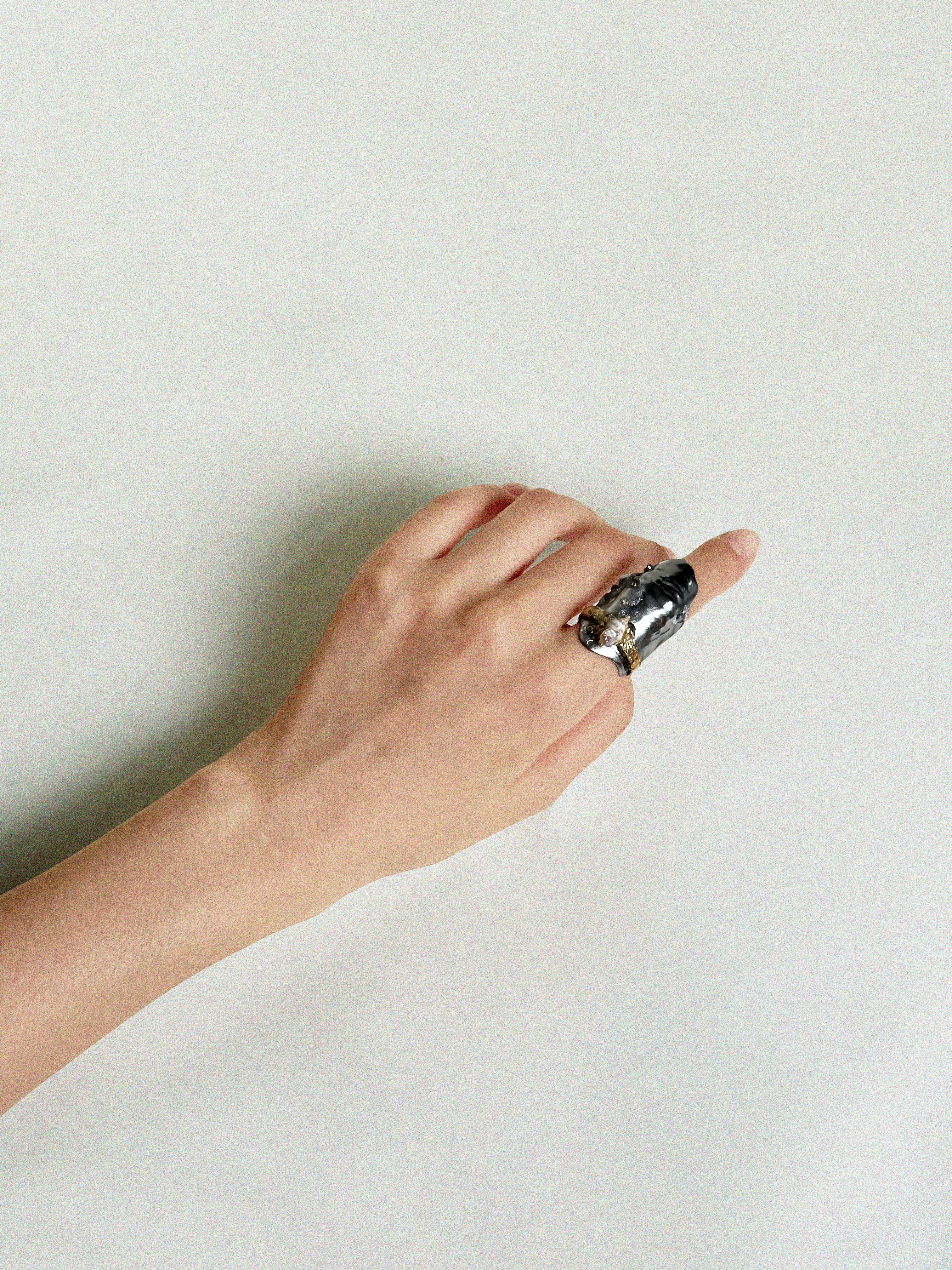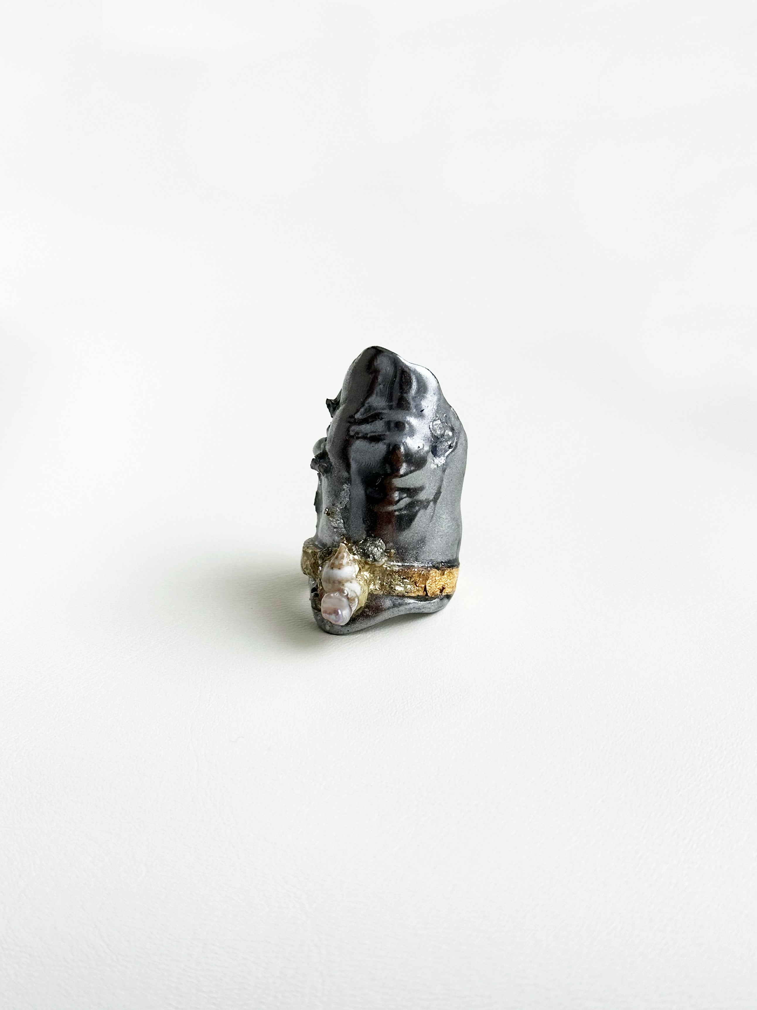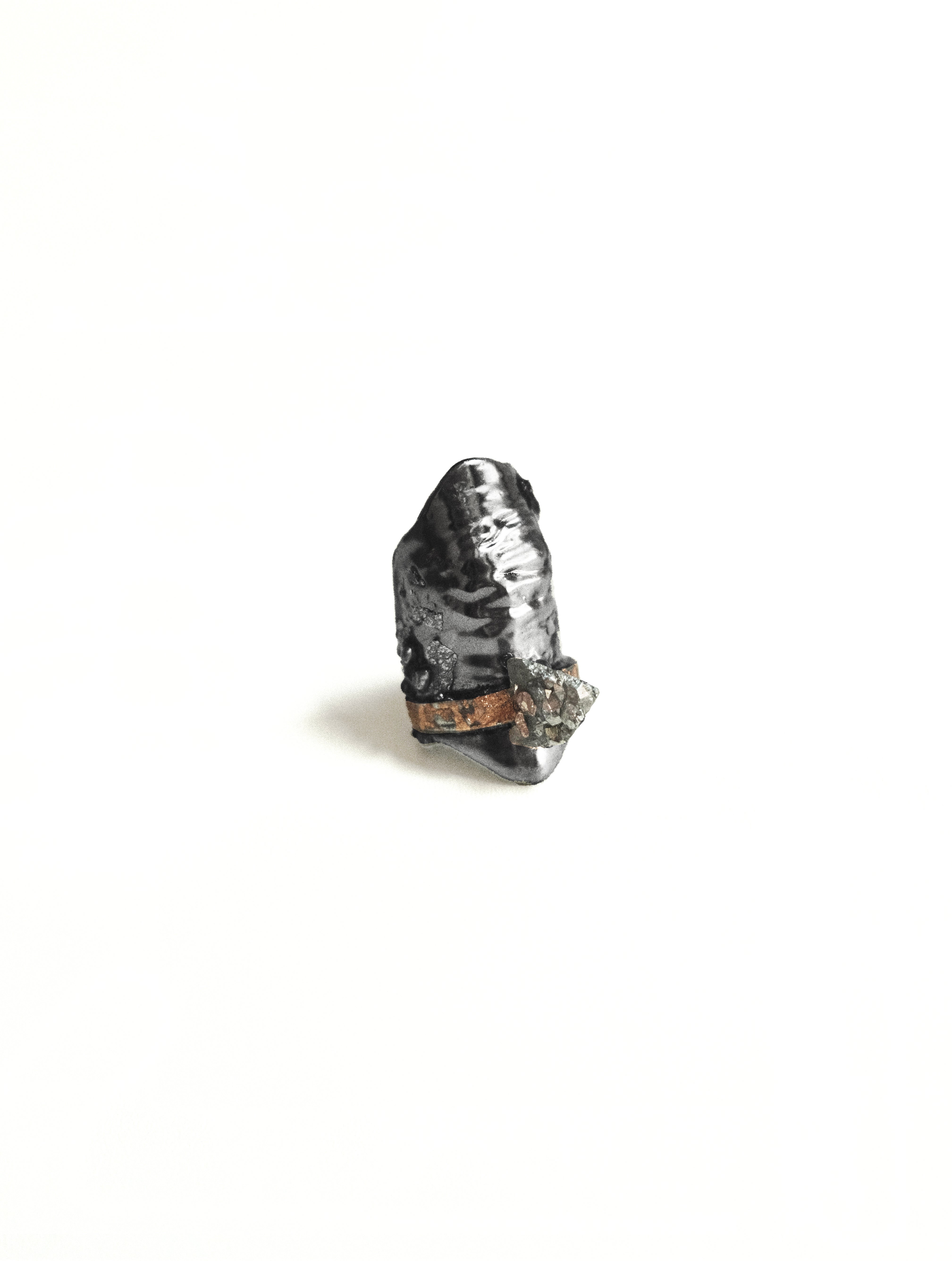 The collection features 3D-printed resin model with a metal-like finish. The Rings are adorned with gemstone inlays. Each piece is handcrafted and one-of-a-kind.