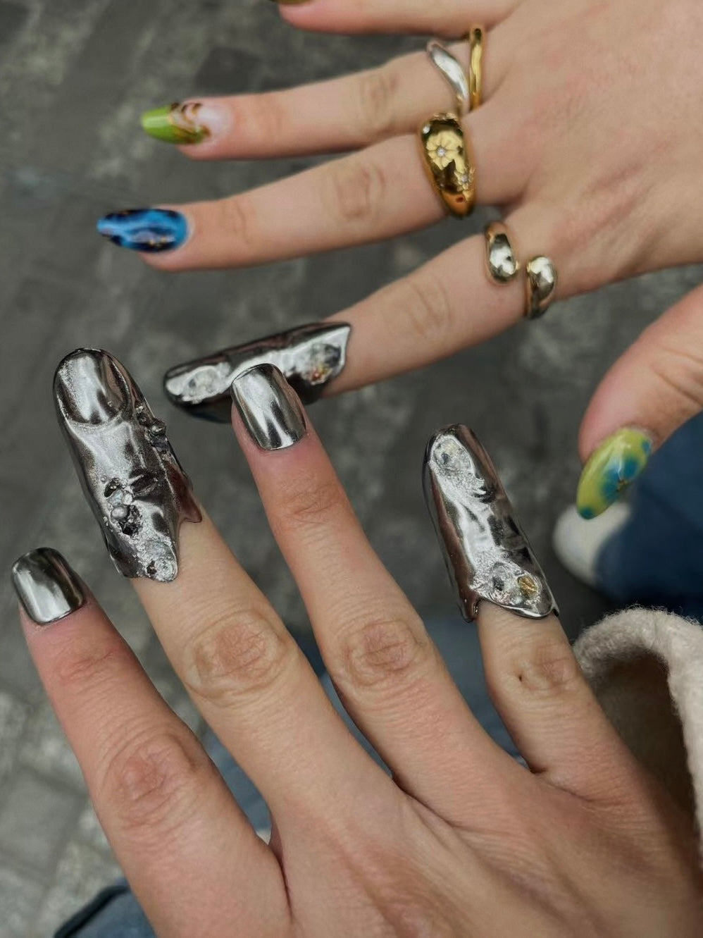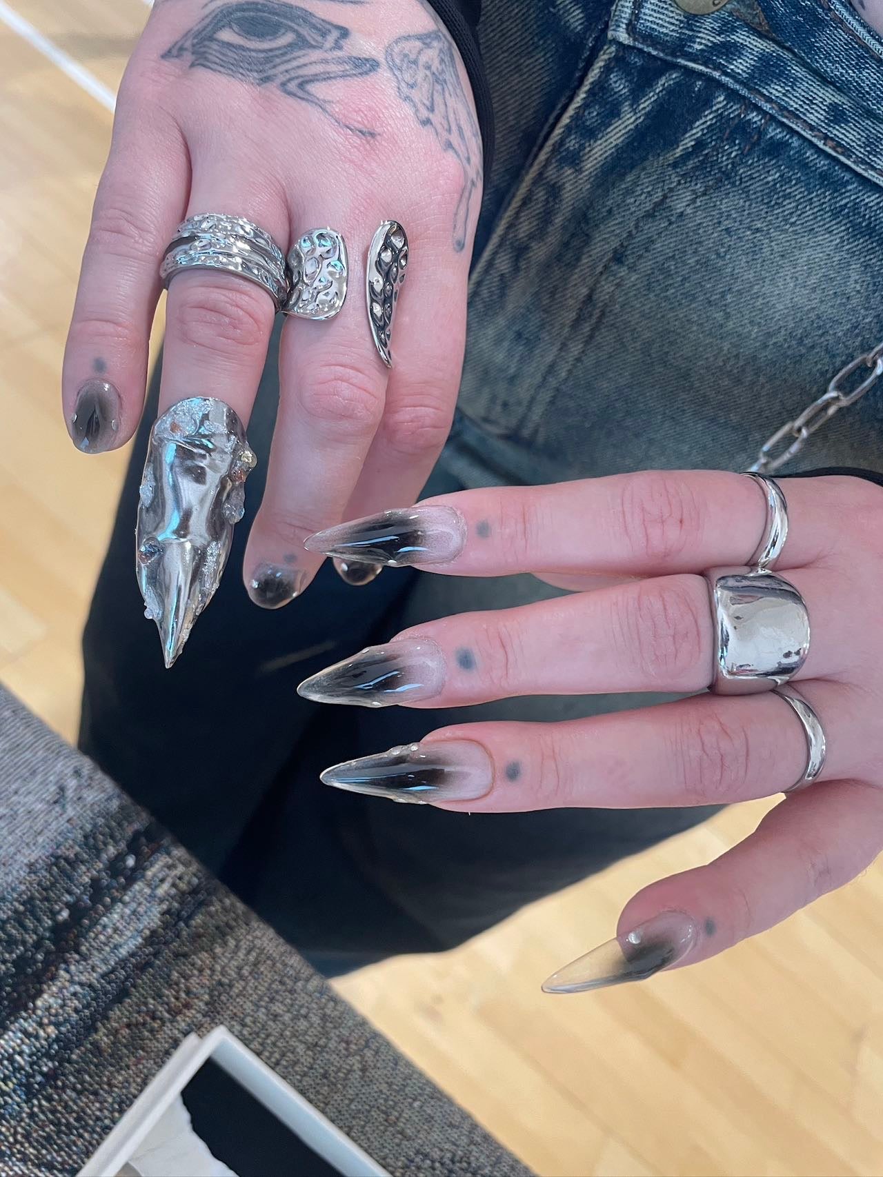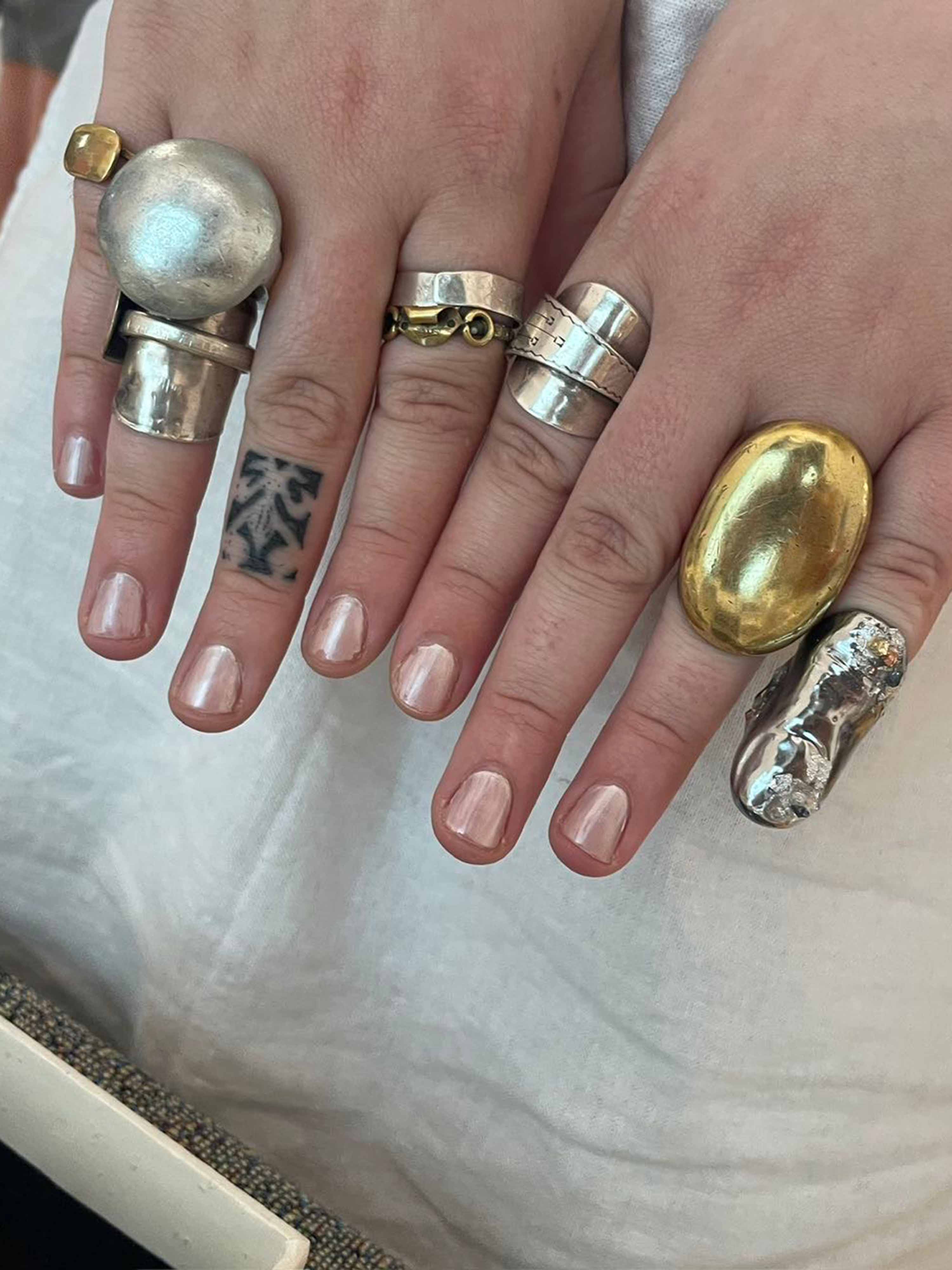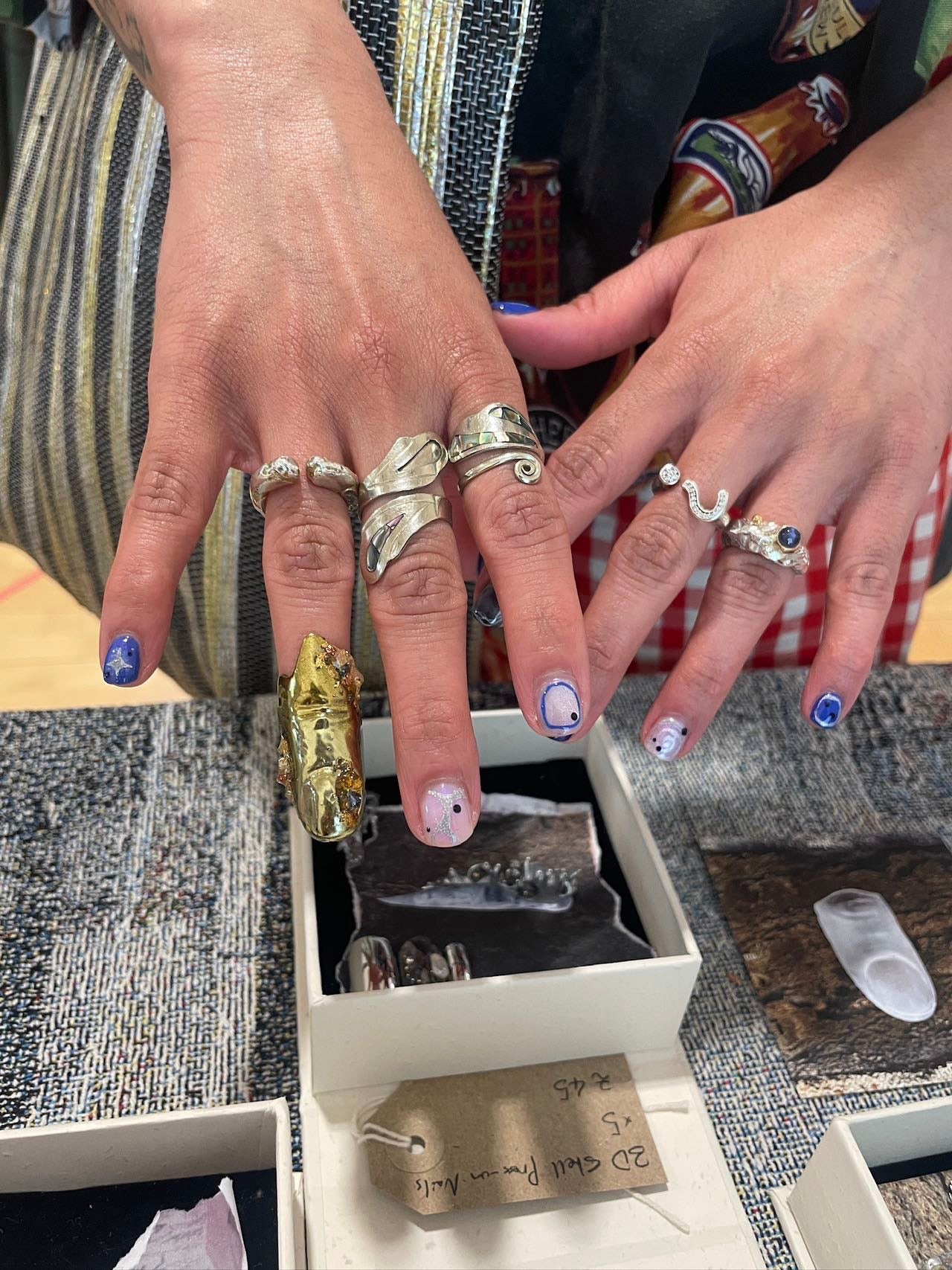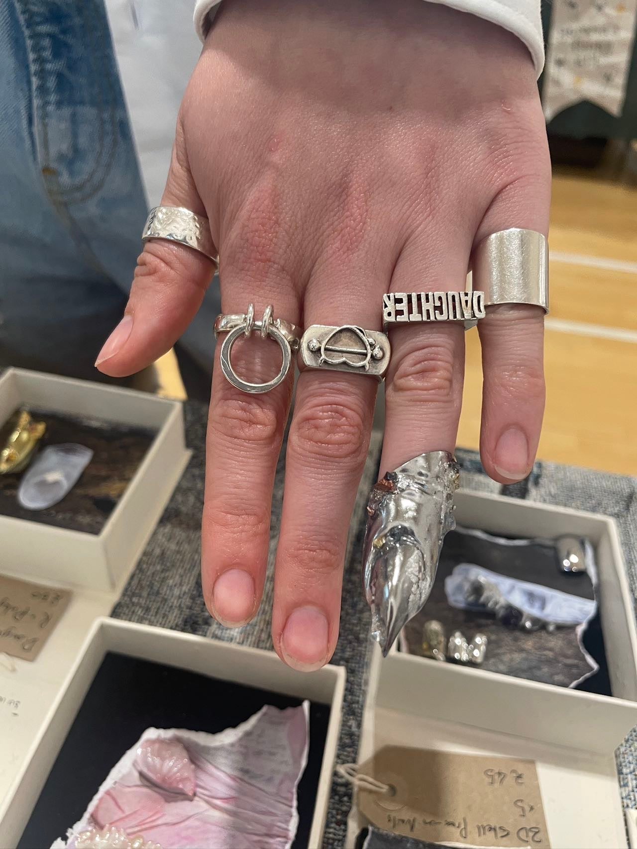 The Rings are adorned with gemstone inlays. Each piece is handcrafted and one-of-a-kind.
