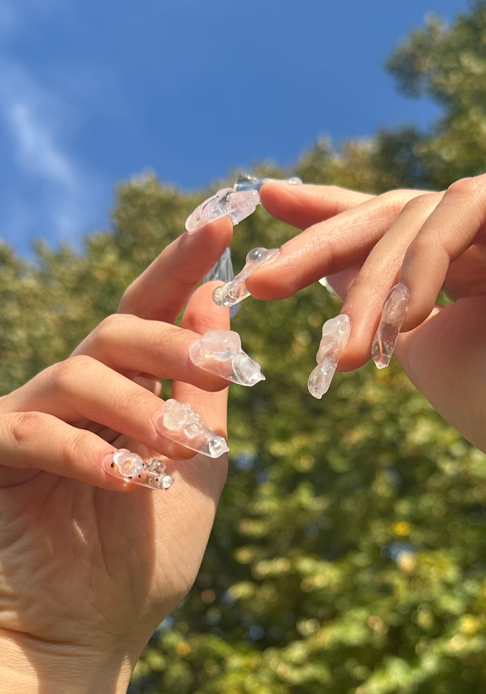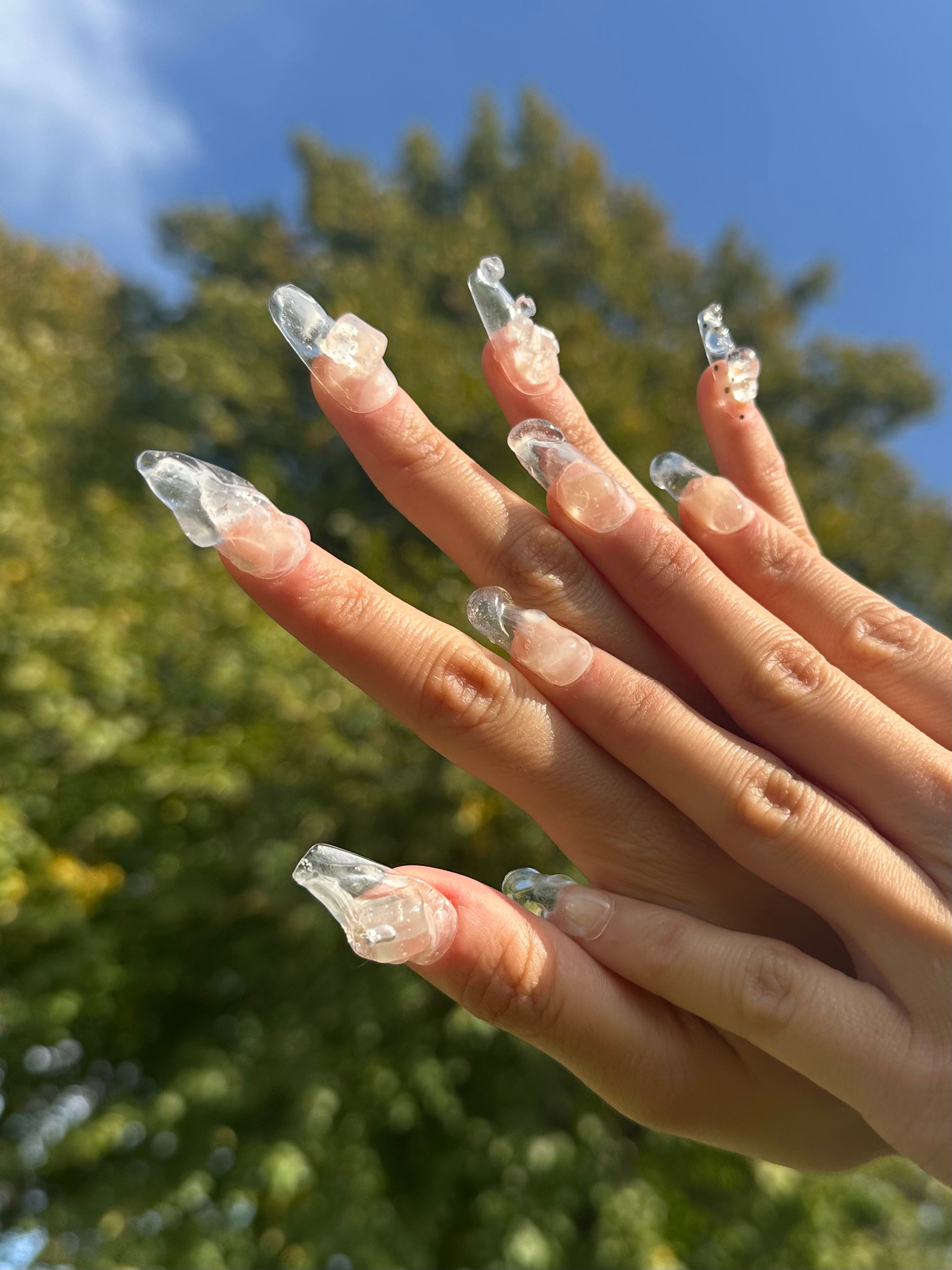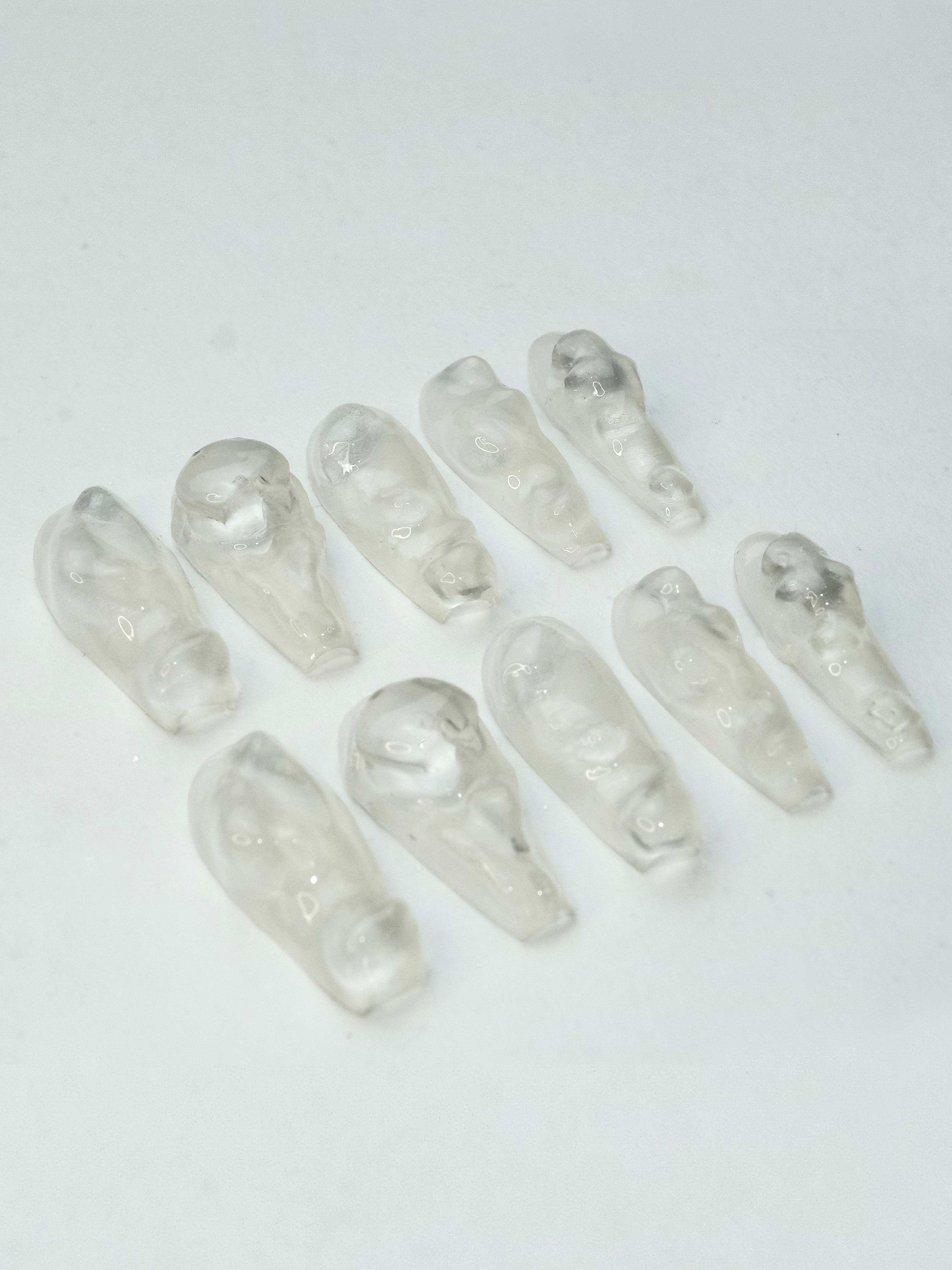 Inspired by the ethereal beauty of melting ice cubes, our Ice Cube Nails feature irregular, transparent 3D sculptural designs that mimic the unique formations of ice. These nails are crafted using transparent resin 3d printed to achieve a glass-like.