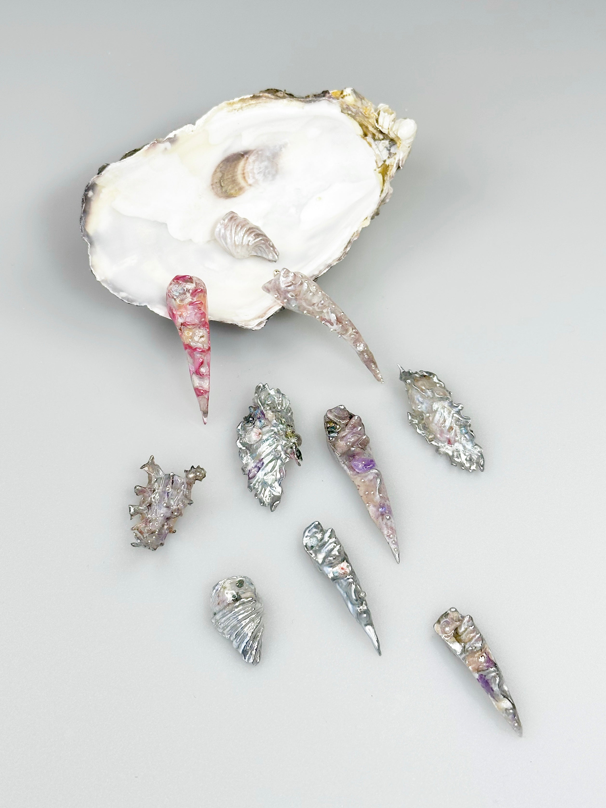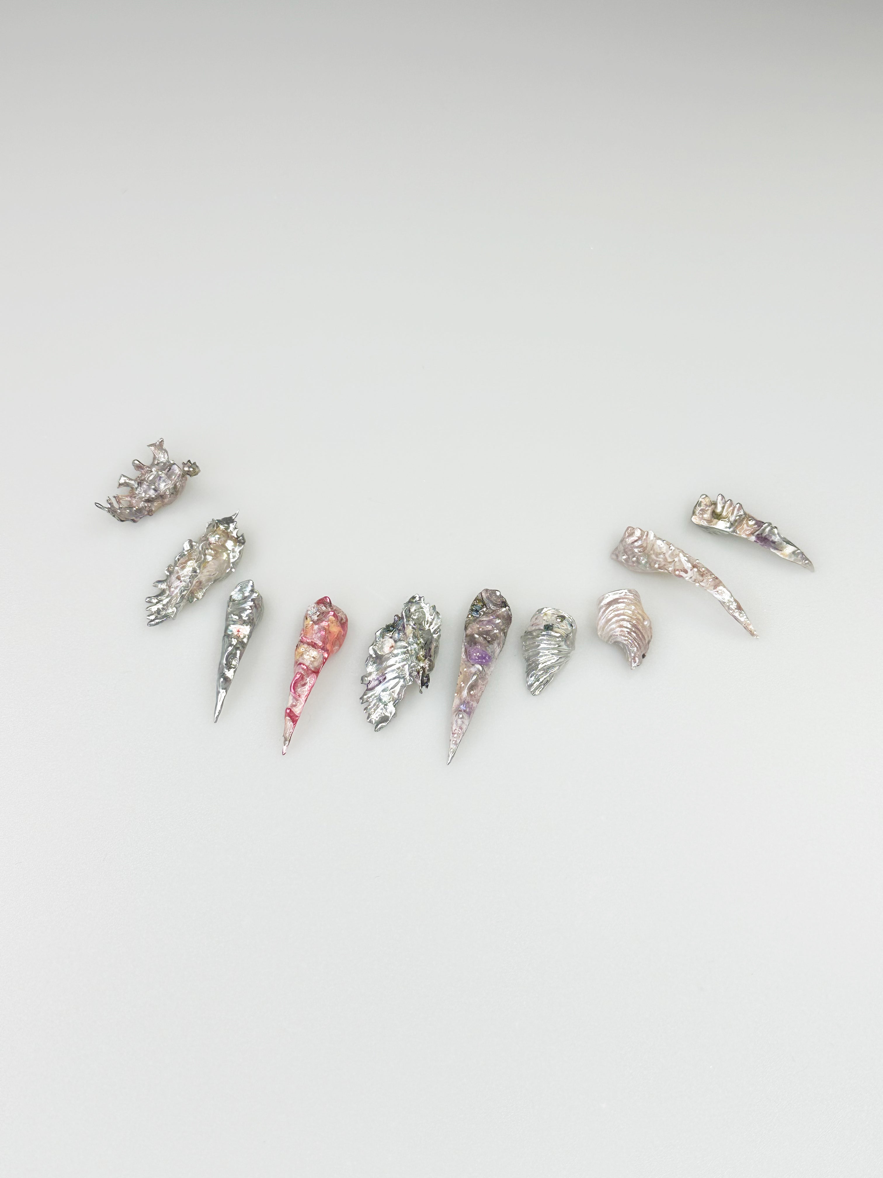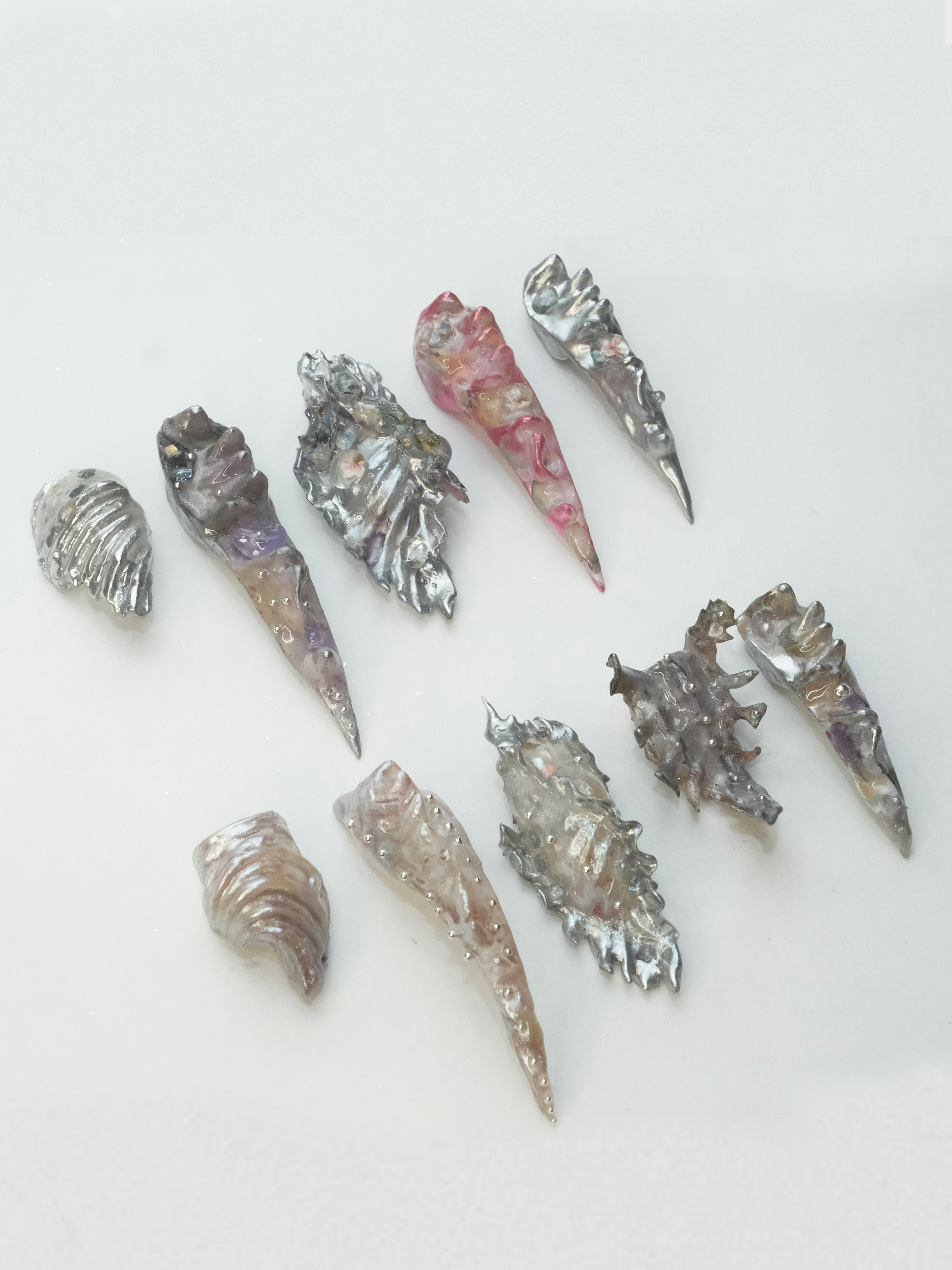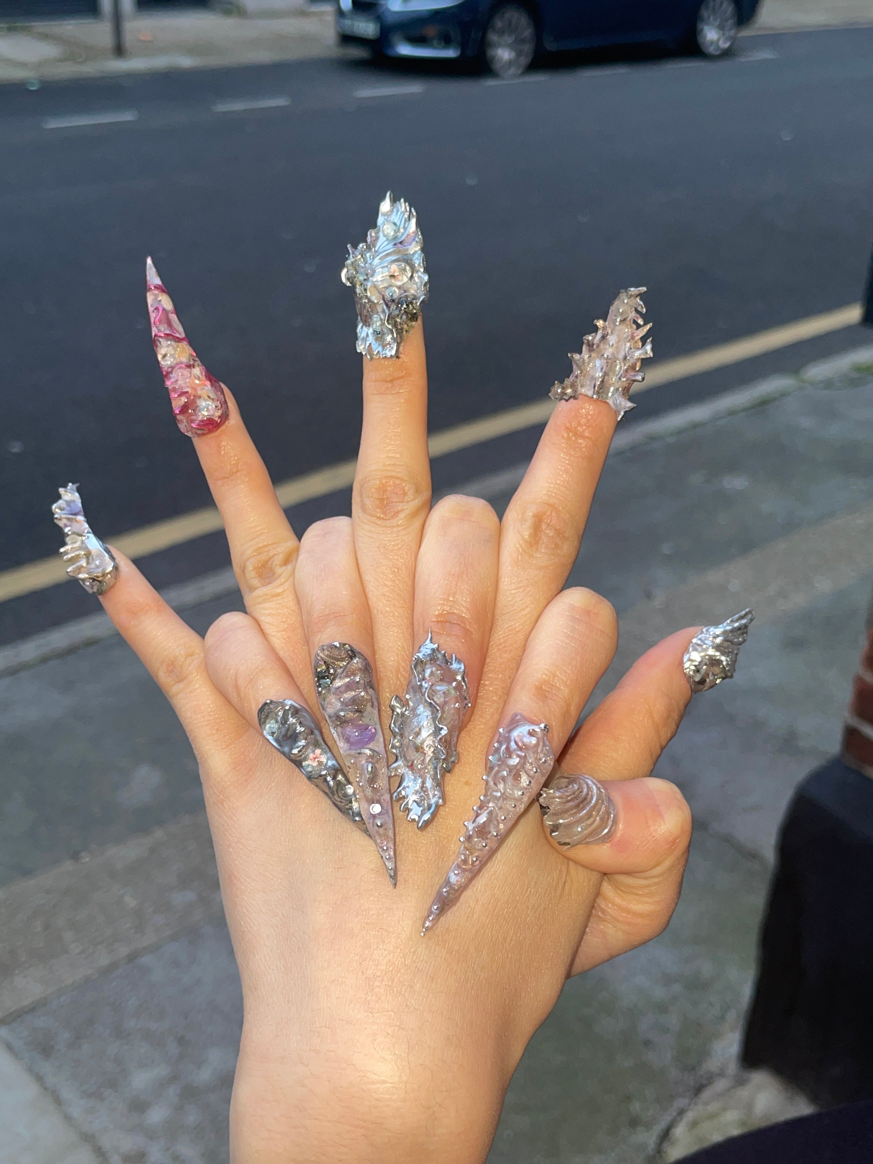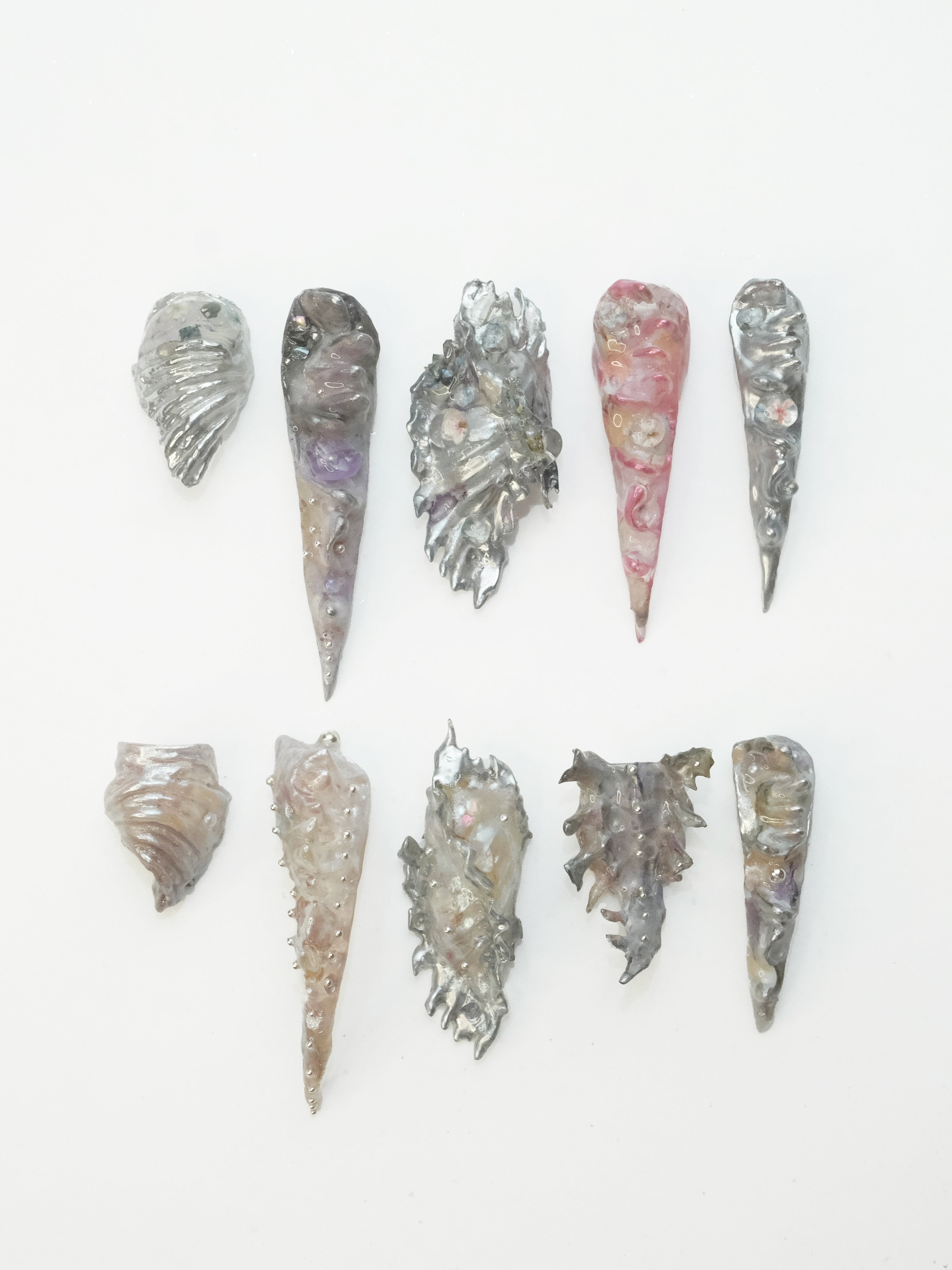Inspired by the natural beauty of seashells, our Seashell Nails combine 3D printed resin with nail art materials for a stunning metallic finish. Adorned with small steel beads and dried flowers, each piece reflects organic forms found in nature. Each piece is handcrafted and one-of-a-kind.
