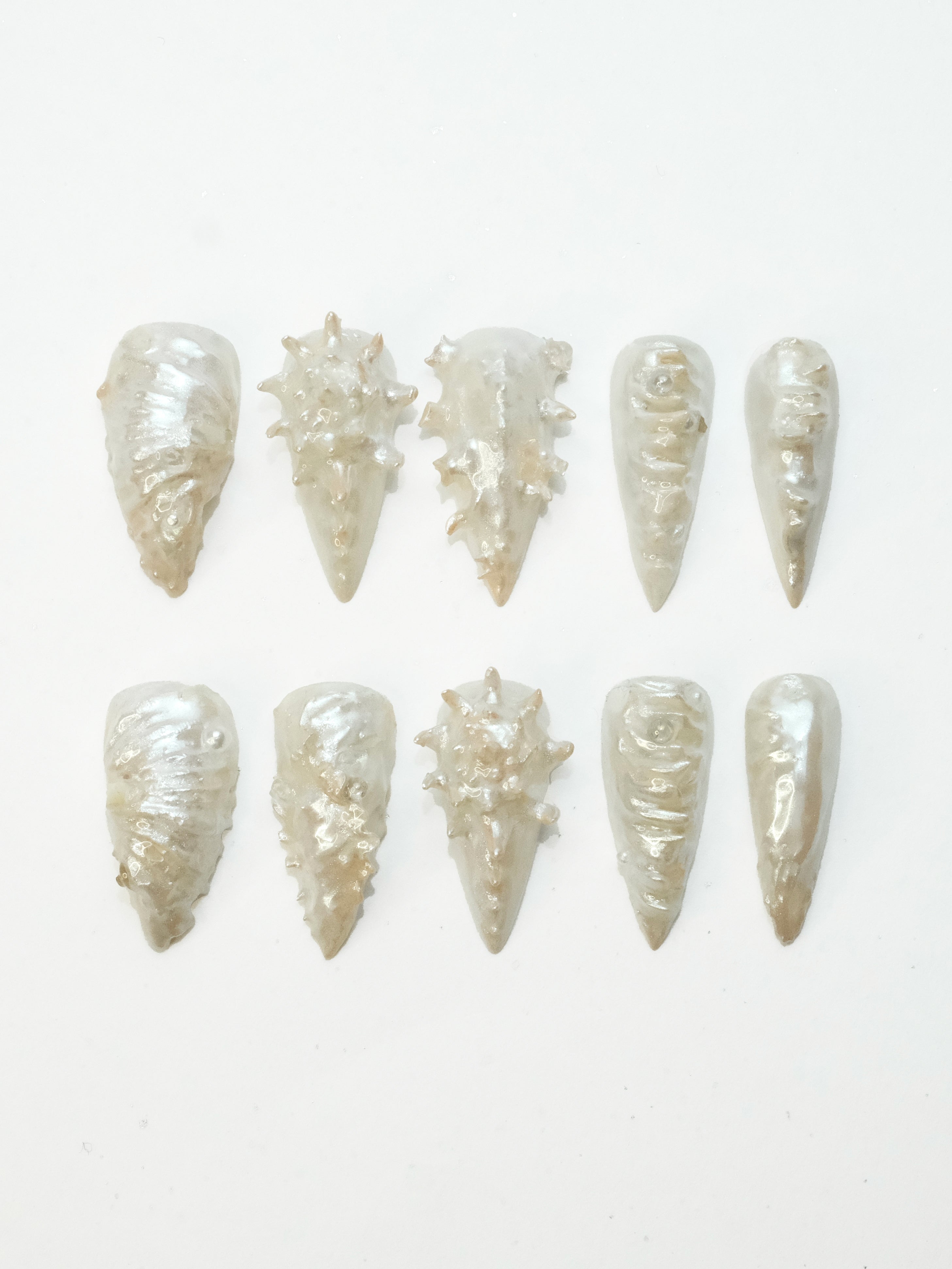 Inspired by the natural beauty of seashells and toasted meringue, the Aphrodite's birth, seafoam, our Seashell Nails combine 3D printed resin with nail art materials for a stunning lustrous finish. Adorned with small delicate beads and sequins. Each piece reflects organic forms found in nature.d